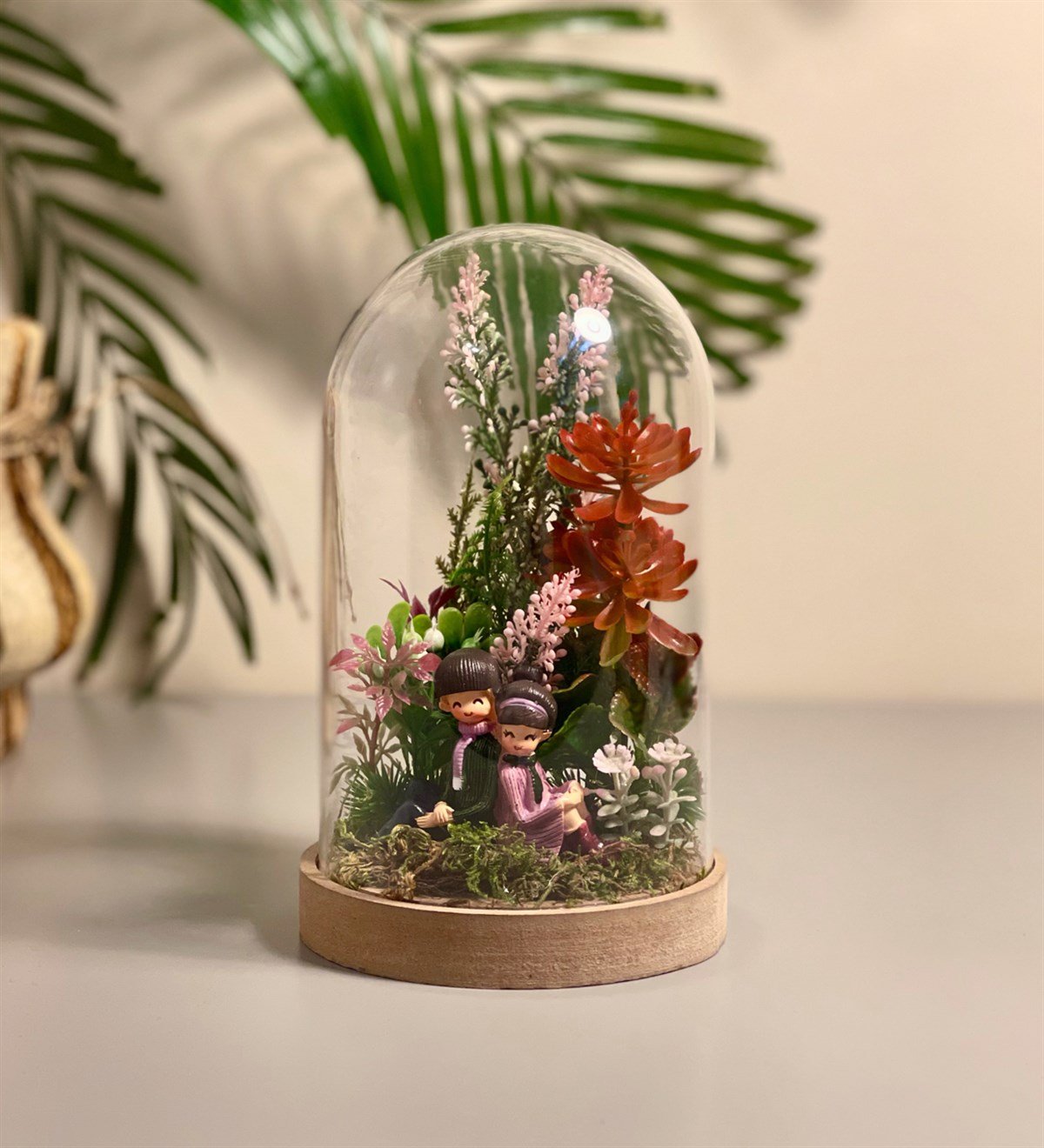 Cam Fanus İçinde Sırt Sırta Aşıklar Çiçek Aranjmanı