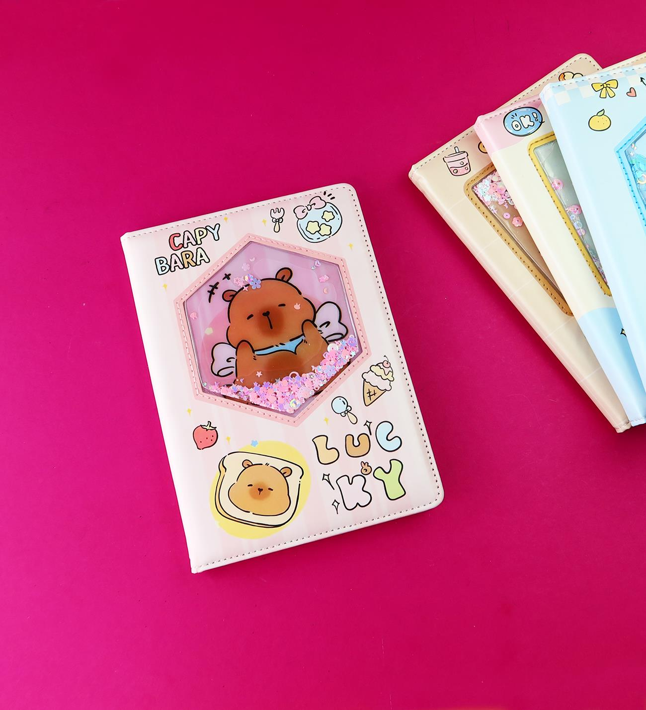 Sevimli Capybara tasarımıyla dikkat çeken bu defter, sulu kapaklı özel tasarımı sayesinde ışıldayan ve hareketli bir görünüme sahiptir. Hem estetik hem de kullanışlı yapısıyla okulda, ofiste ya da günlük hayatta not almak için ideal!