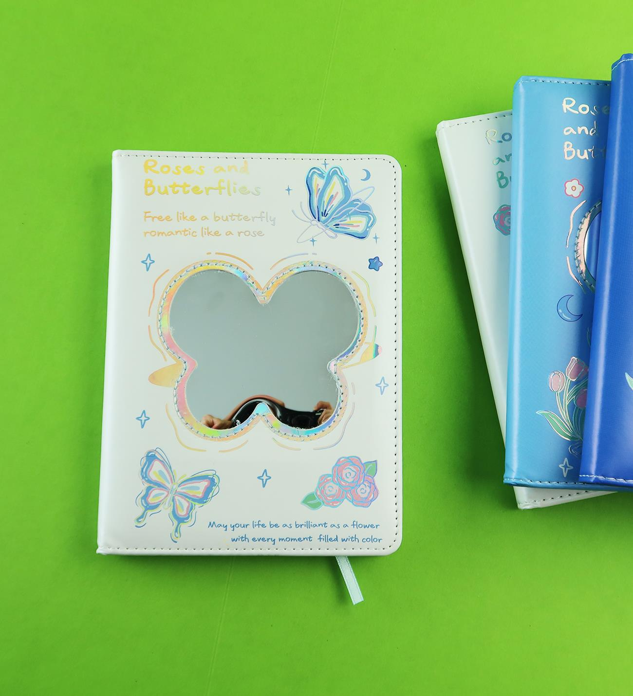 Roses and Butterflies serisi, pastel tonları ve zarif detaylarıyla romantik bir tarz sunar. Kelebek şeklindeki ayna kapak tasarımıyla dikkat çeken bu defter, hem estetik hem işlevsel bir planlayıcıdır. İç kısmında farklı sayfa düzenleri (çizgili, planlayıcı, noktalı) yer alır; yazı, çizim ve planlamayı bir araya getirir.