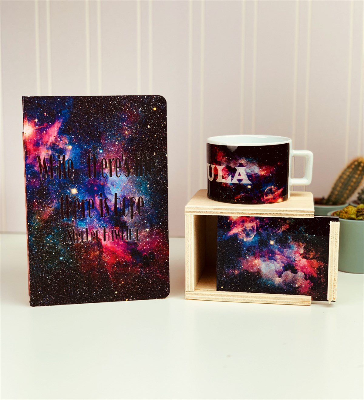 Uzay Tasarımlı kutulu kupa ve lak defter harika bir hediye seti.
